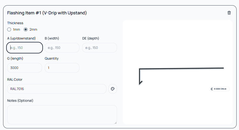 Our guided measurement tool makes ordering custom flashings simple. Just enter your dimensions for each leg of the profile and we'll manufacture to your exact specification.